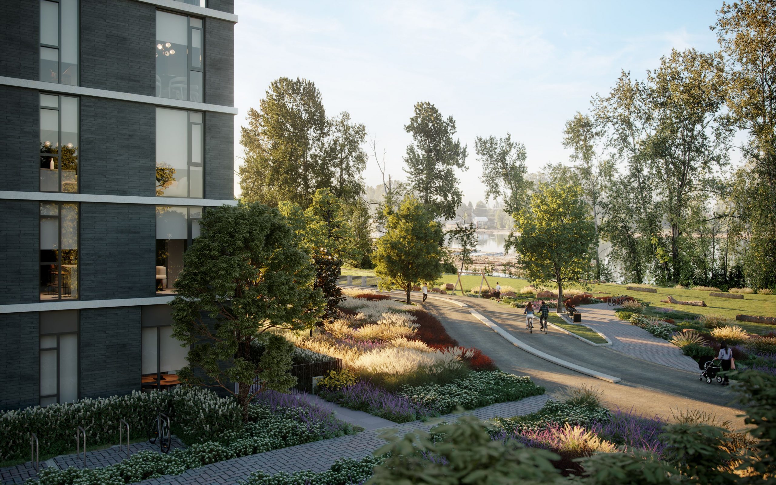 The decades old industrial history of this location provides much of the inspiration behind the four buildings that comprise Ardea. With dark façades, metal accents, and varying heights, the architecture is bold, but undeniably timeless. Lush plantings and greenery weave throughout the buildings, seamlessly flowing into the new Kinross Park and the shoreline of the Fraser River.
